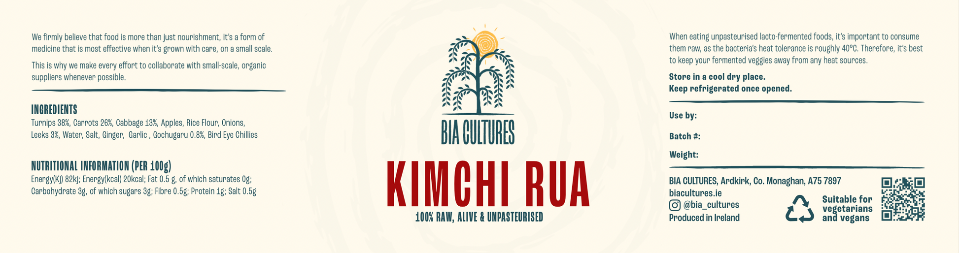 Our take on Kimchi includes instead Irish Vegetables in season at the moment like Leeks, Rutabaga, Cabbage, Carrots plus some ingredients preserved last Autumn like Apple, Garlic and Onion.
